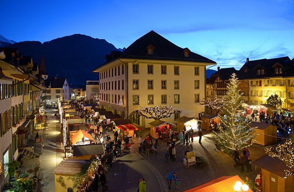 Adventsmärit und Chilchefescht in der malerischen Altstadt Unterseen. Mit über 60 Holzhäuschen und Marktständen, Karussell, Streichelzoo und Samichlaus.